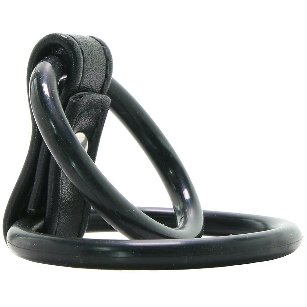In supple stretchy rubber, the smaller ring wraps around the base while the larger loops over the testicles, tugging  subtly. The snug constriction can help keep over-stimulation under control and enhance orgasm when the moment finally comes (so to speak).