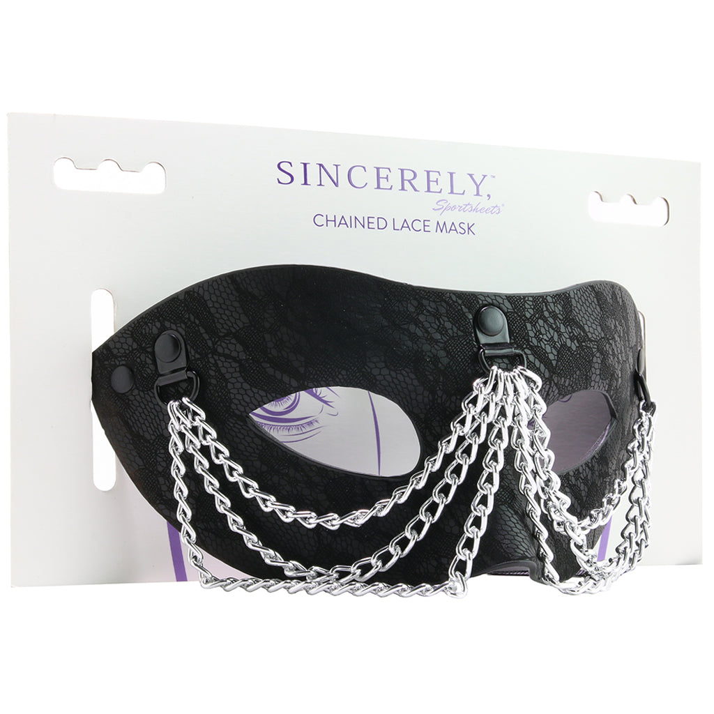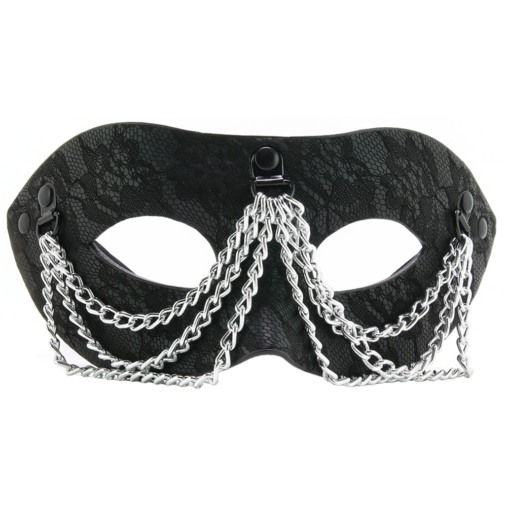 In classic masquerade style, the contoured black lace patterned shape fits over the top of the face, leaving eyes wide and free to seduce. Effortlessly adding an air of mystery as it conceals just enough, the Mask features swooping lengths of delicate silvery chain to hypnotize and captivate. Silky ties secure around the back of the head.