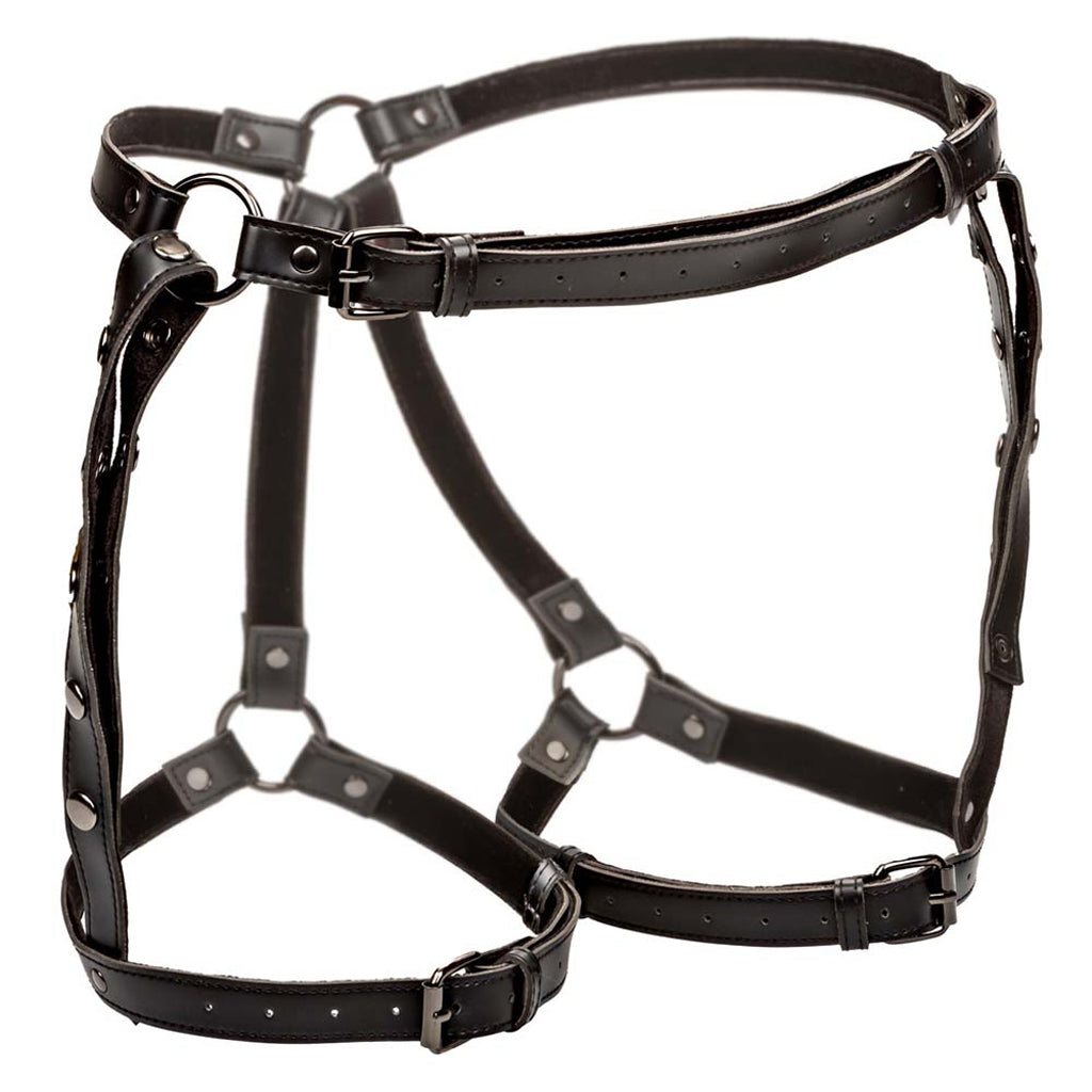 The comfortable, velvet-lined harness buckles over your or their waist and each thigh, holding studded straps vertically over the wearer's hips. Four O-rings can be clipped or clamped to cuffs, leashes, tethers, and more - if you're so inclined!