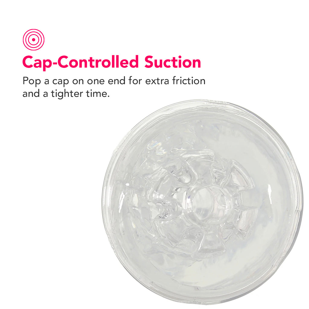 Offering up two points of entry, both neutral, the Double Fantasy also features two distinct textures, one for each side. The ultra soft sleeve in crystal clear, magnifying jelly grips and clings naturally - keep one of two included caps in place over the side you're not using to maximize friction.