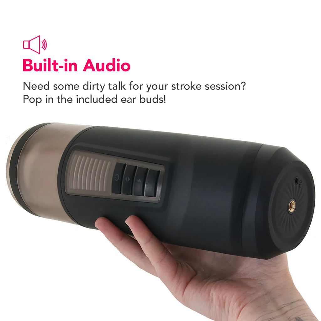 At the entrance of the Message, tucked into a sturdy plastic case (featuring voyeur-friendly windows), a soft butt welcomes you/your playmate into a snug tunnel of beaded texture. At the touch of a button, seven modes of synchronized modes of spinning thrusts spring to life. Just in case that's not enough to send you flying over the edge, Message In A Bottle features two distinct voices moaning and saying some filthy (super sexy) things. A pair of ear buds are included - they'll need to be attached to hear all the oral encouragement.