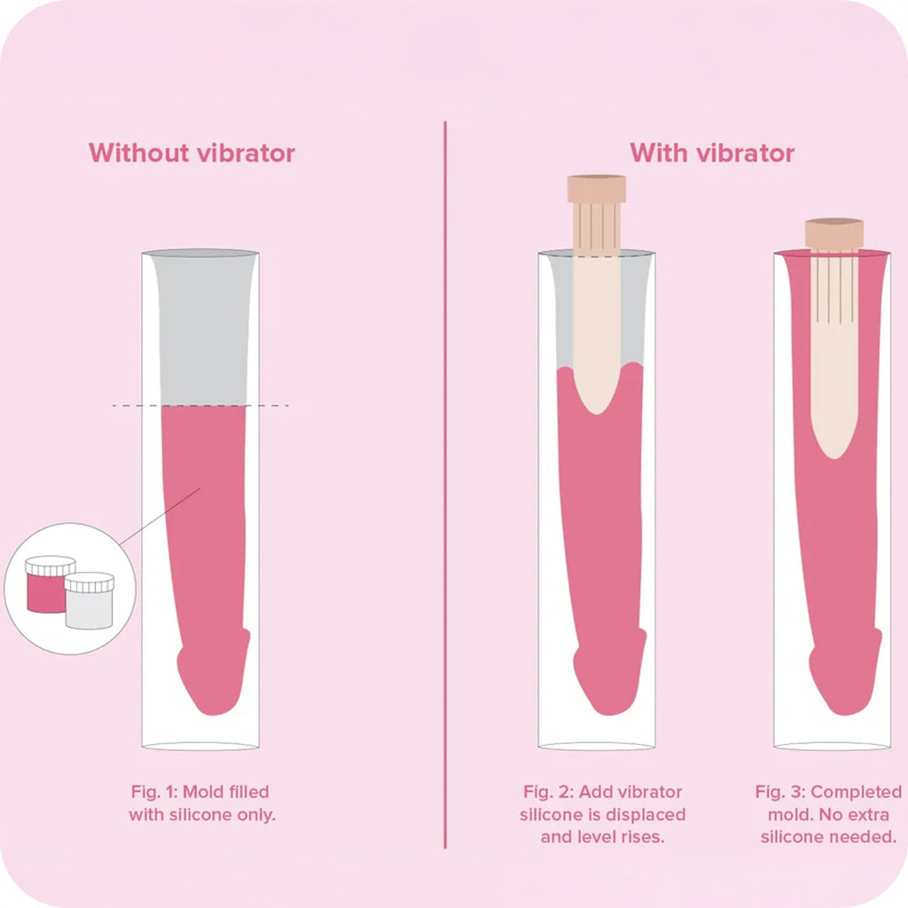 The process is easy. Mix the molding powder with water, pour it into the tube and get yourself or them hard and ready to dip. Slide inside and hold still for a minute or two as the molding material captures all the details. Pull out, pour in the silicone, center the included vibe and let it set.