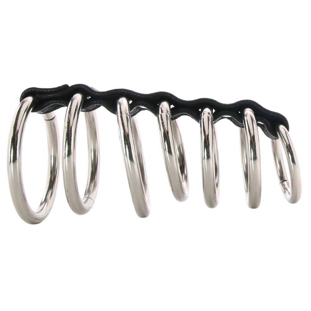 This sturdy, great looking tool boasts seven strategically positioned, size-graduating steel rings joined by a soft leatherette (PVC) strap. It perfectly contains the cock in question, and is meant to be worn with the largest ring looped around the testicles. Use a favorite lube to ease the Cage into place and let the night unfold as it may.