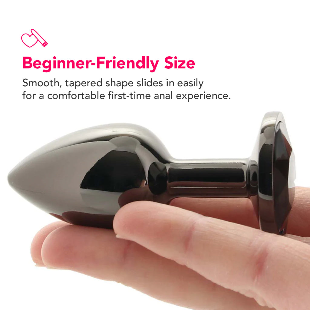 In seamless silvery metal, the Small Black Gem Anal Plug is safe for sensitive skin. Extremely easy to clean, a must-have feature of any good quality anal toy, this plug will be squeaky clean after a thorough scrub using warm soapy water or a good antibacterial toy care fluid/foam. Compatible with all lubricant types. Avoid abrasive surfaces to keep this plug in play-ready shape for the long haul.