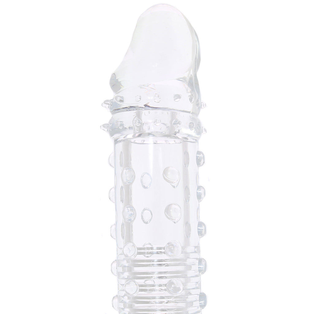 In plushy crystal-clear TPR, the Sleeve slips easily over penis or dildo- a little water based lube will help slide things along. Ribbed at the interior, the wearer will feel an extra jolt of sensation, plus, the texture helps hold the sleeve in place.