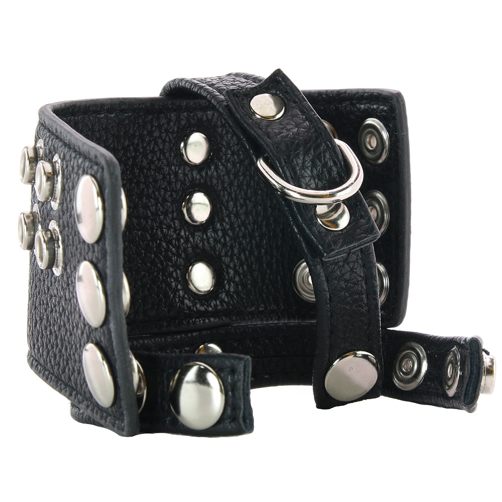 Looping over the shaft and securing with snaps, the Ring's main strap holds tight to help maintain erection. Snapping into place at the base of the scrotum, a thick 2" (5cm) band tugs the testicles away from the body while a third gently splits the balls. Add extra weight to the stretcher area using an attached ring.