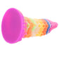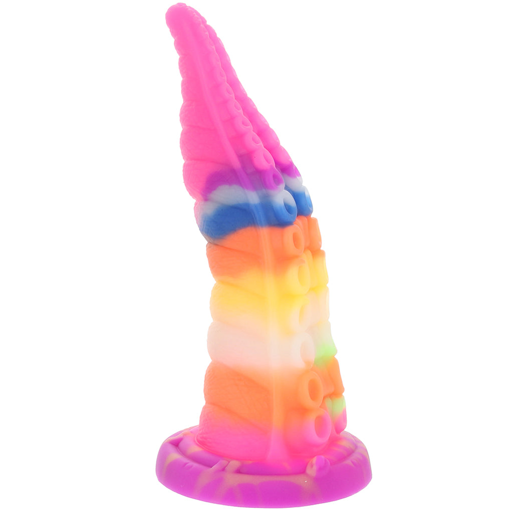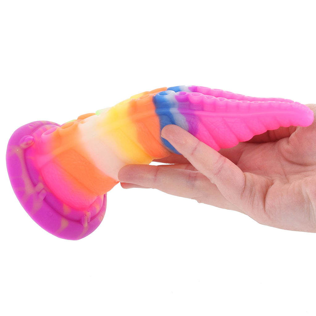 Shape-wise, this rainbow-y tentacle is curvy and softly pointed up top. Once past the tip, it widens out for plenty of stimulating stretch. There's texture all the way down to the suction-cup base, from sexy little suckers on one side to thick waves on the other.