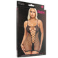 Up top, this classic halter style piece dives low to bare lots of cleavage and upper back skin. The extra wide-weave net down the center leaves very little to the imagination; same with the skimpy little skirt. Pair it with some other lingerie favorites, or rock it solo.