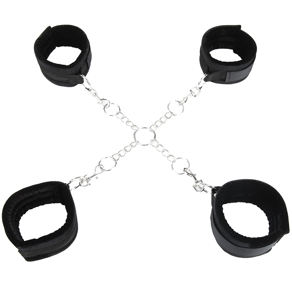 Perfect for any level of bondage indulgence, the 4 soft included velcro cuffs don't require any previous experience, they're incredibly simple to use and adjust to fit almost everyone thanks to friction free swiveling clamps. Whether you're in the mood to truss up your playmate's wrists and/or ankles, the Deluxe Chain Hogtie will definitely do the trick, holding tight without chafing.