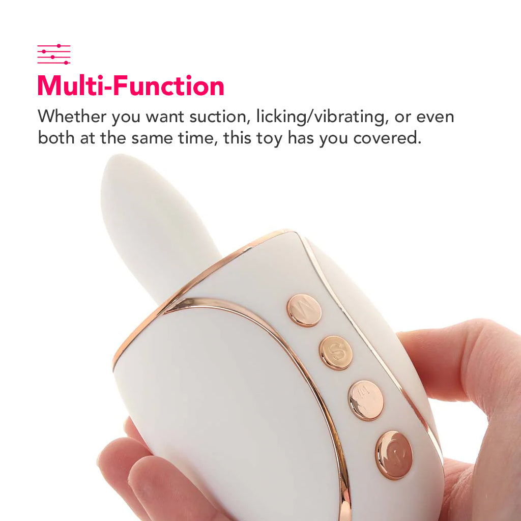 To add suction to the tongue-lapping action, attach one of the two included cups to the base (it fits over the tongue.) While both cups are contoured for an airtight seal around your or your partner's vulva, breasts and beyond, one is smaller and the other larger. Pick your size based on which sweet spots you're planning to surround. Suction revs up with a separate button, and gently draws sensitive flesh upward into the cup. This not only plumps, primes and sensitizes, but also brings the body part in question closer to that eager tongue. The tongue motion can be combined with suction, or not, it's all up to you.