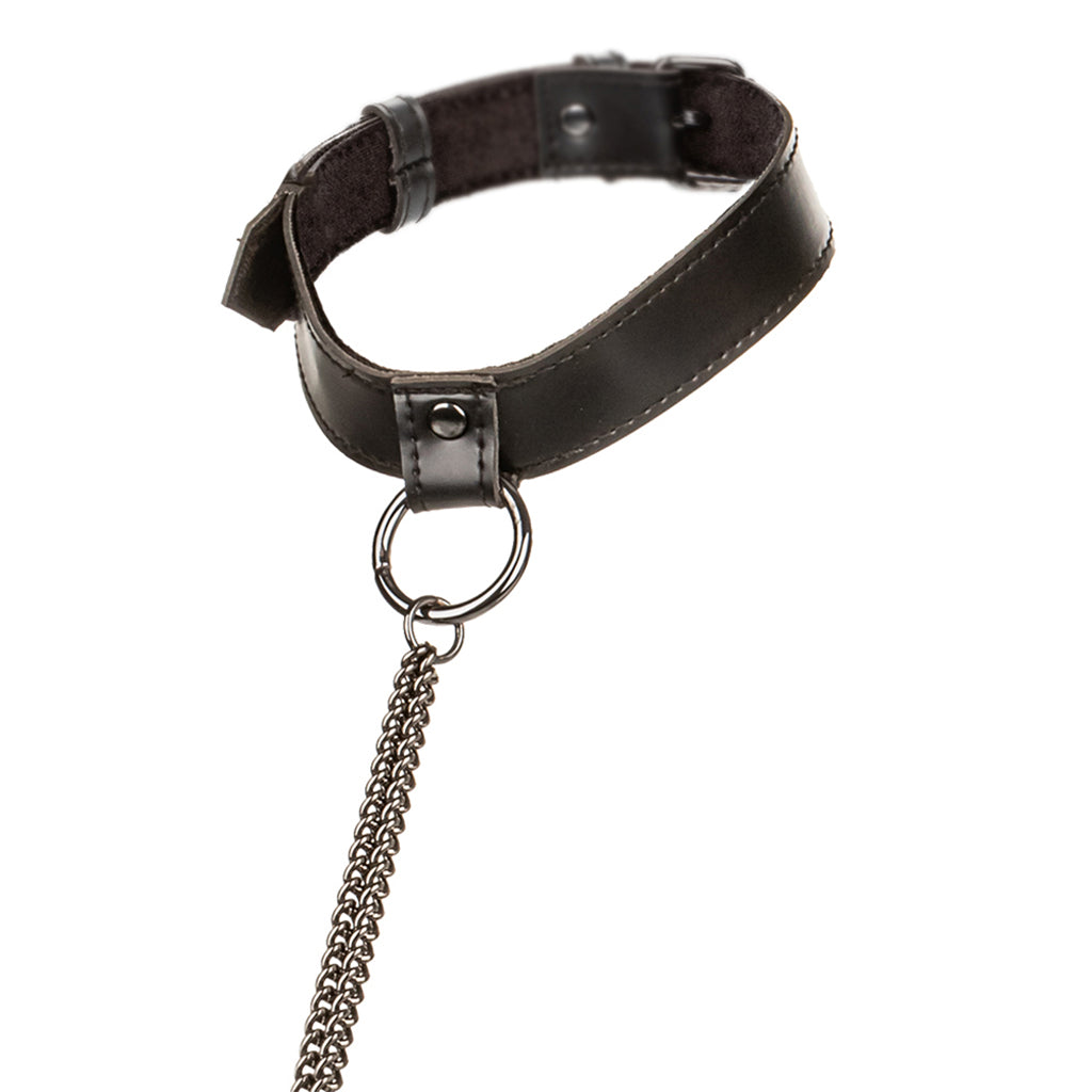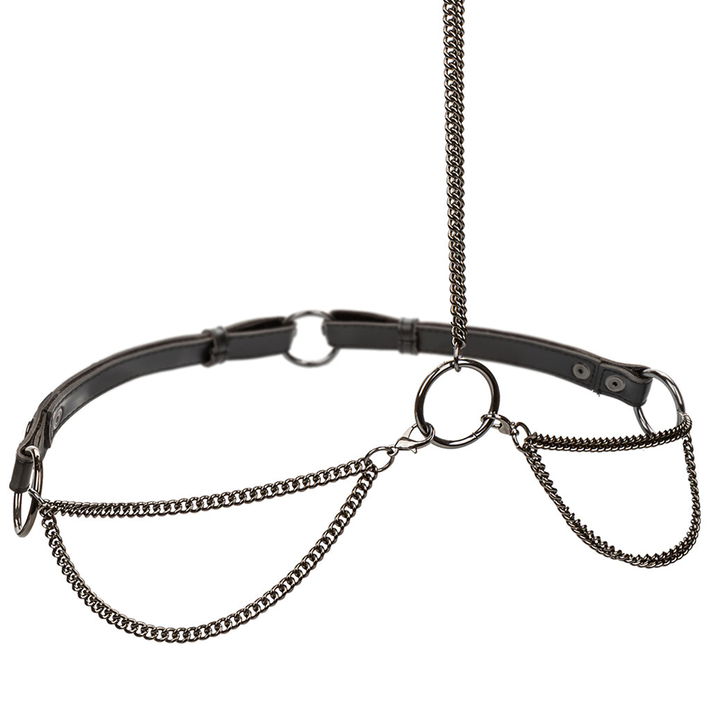 Worn as a body harness, the velvet-lined collar clasps at the neck while a hip strap cinches your waist. Chains swing and shimmer with every move, showing off your curves and your confidence. Want to switch it up? Unclip the front chain for a classic collar-and-leash moment that says, "yes, I am in charge—or maybe not."