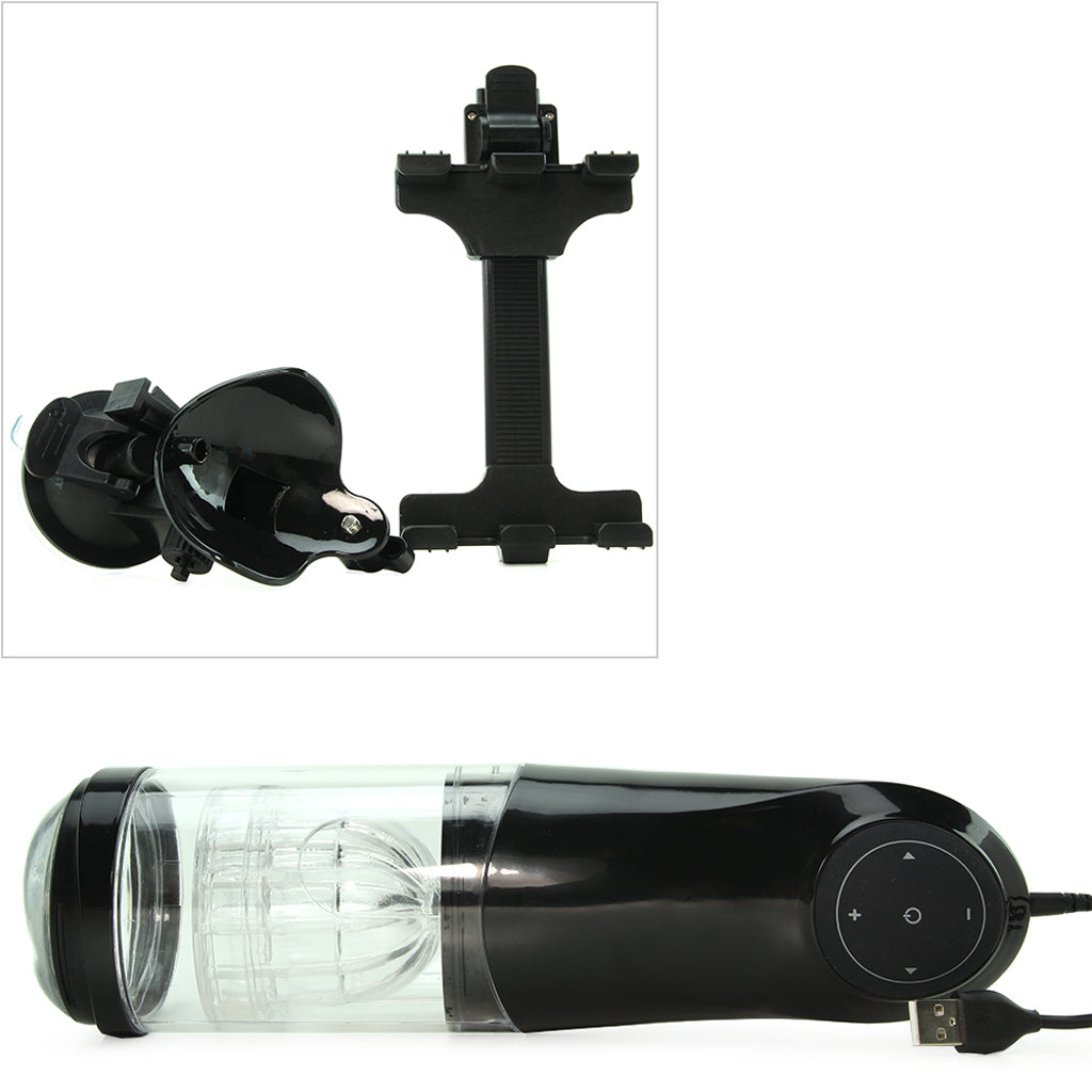 The Mega-Bator Ass comes complete with a pivoting suction base easily attached to the bottom of the stroker- screw it into the plastic casing, angle as desired, and lock into place for fully hands-free sessions. As for the device holder, the spring-loaded clamp base slides securely onto a dedicated arm that can be angled for the best view. Fits most standard smart phones and small tablets.