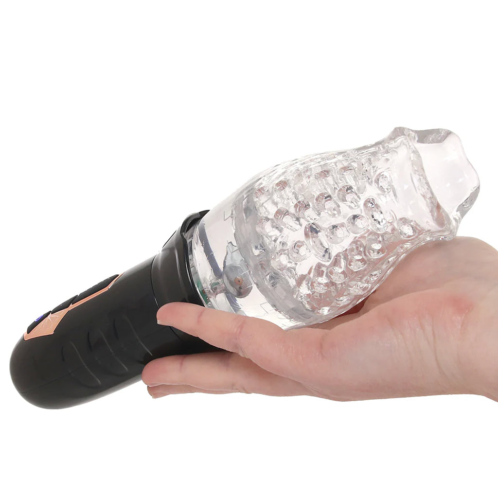 At the entrance, abstract lips lead to a crystal-clear chamber lined with over 100 soft, massaging fingers. As the chamber rotates 360 degrees, a powerful bullet inside buzzes at the tip for maximum stimulation. Use rotation and vibration together or on their own—either way, it’s a wild ride.