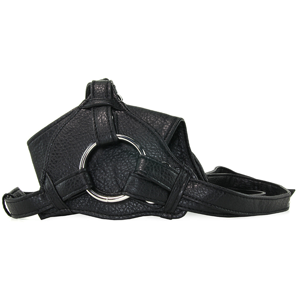 Wide at the waistband, the vegan leather Queen fits comfortably over the hips as two thin straps reach around to loop under each cheek. Simply tug the strap ends to adjust sizing. Set dead-center of the yoke, a rigid 2" (5cm) metal O-ring snaps into three holders, securing a dildo or vibe of choice into place. Just about any toy with a diameter of up to 2 inches and a flanged base can be slipped through the ring and steadied into position.