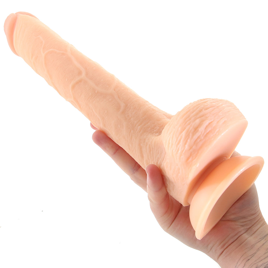 Shaped into a gigantic shaft that'll dive extra deep, the 11 Inch Straight features tons of length and lots of textured thickness. Safe for butt play and far-reaching sweet spot seeking, Straight's base is big and ballsy, helping to prevent any too-deep slips. A sturdy suction cup beneath those big balls holds steady, positioning your dildo vertically on the floor or a counter top, or horizontally on a wall or window - any smooth, nonporous surface, really. For yet another hands-free option, this dildo can be enjoyed in combination with many O-ring harnesses and strap-on garments thanks to some distinct separation between balls and suction cup.