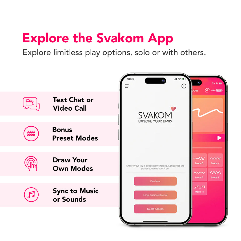Want even more control? Download the Svakom App. Once installed, you or your partner can access unique sound, voice, touch, and music-activated vibration patterns, webcam options, and more. You'll even be able to control your partner's Jordan (or vice versa) from anywhere in the world, provided you both have the app installed and access to a strong internet connection. Play on!