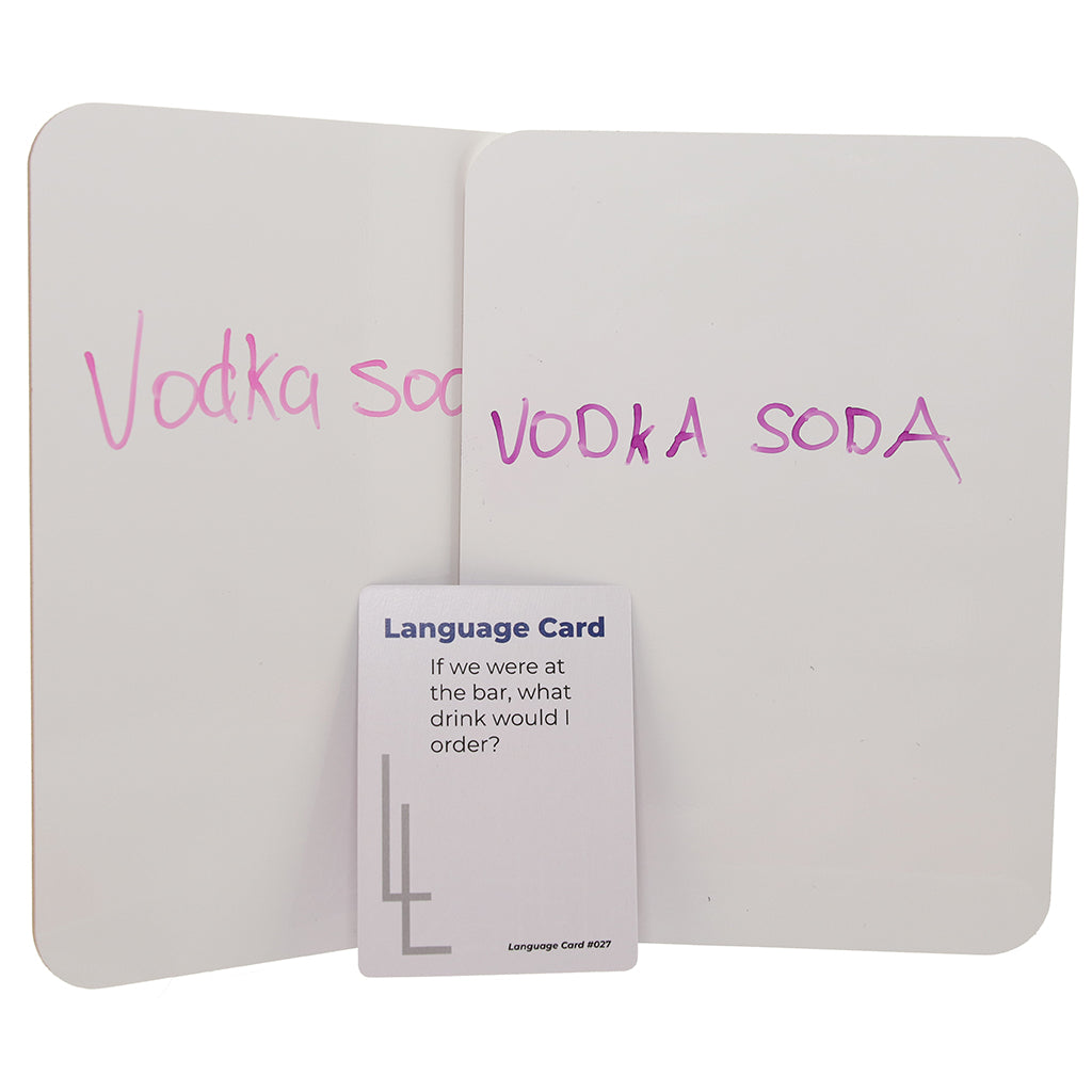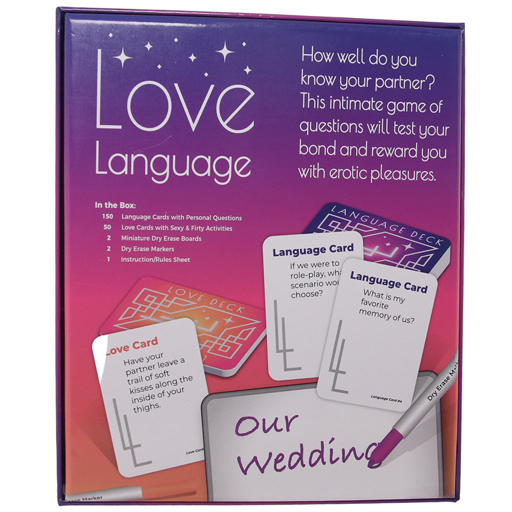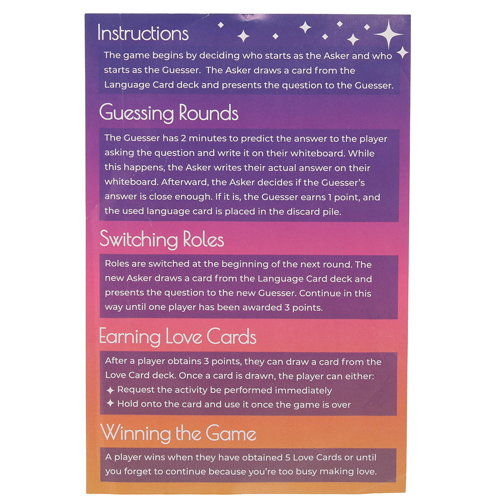 One partner answers a question on a Language card, the other guesses it, and you both write your answers on your own mini whiteboards for the big reveal. Cue the giggles and bragging rights! Questions range from sweet to cheeky, so you can keep things cozy or turn the heat up fast.