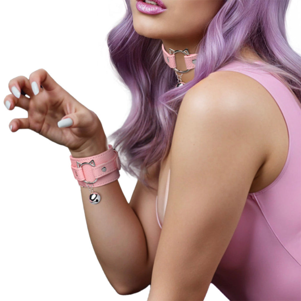 This set leans all the way into cute-meets-trouble. Soft pink restraints, jingling silver bells, and kitty-shaped hardware give everything a playful look that’s clearly not just for show.