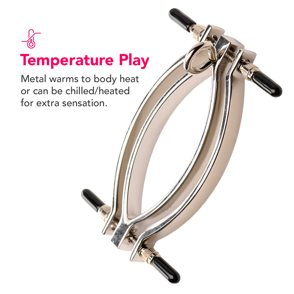 The Pussy Clamp was designed to fit over the outer labia or lips, with an edge tucking away below, and the other framing the entire vulva. Once in position, you or they will be able to increase or decrease pressure on the outer edge, pinching or spreading the outer labia. Clip on the 31"/78.7cm leash if you're both in the mood.
