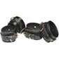 Included: 1 Belt - 30-40"/76.2-101.6cm circumference, 2 Thigh Cuffs - 17.5-25"/44.4-63.5cm circumference, 2 Wrist Cuffs - 5-9.75"/12.7-24.8cm circumference, 2 Ankle Cuffs - 6.25-11.75"/15.9-29.9cm circumference, 2 Garters - 10.5-15.75"/27-40cm long (with clips), 2 Cuff Connectors - 7.5"/19cm long, 1 Hog Tie Connector - 13.25"/33.7cm long straps