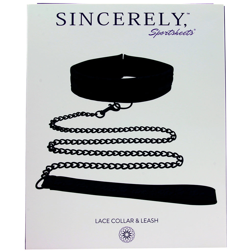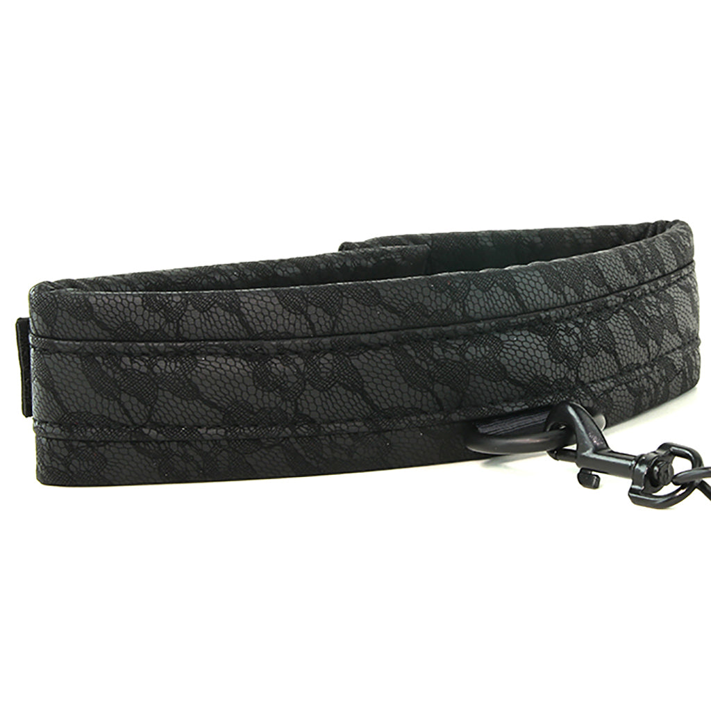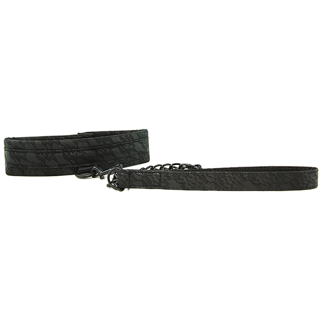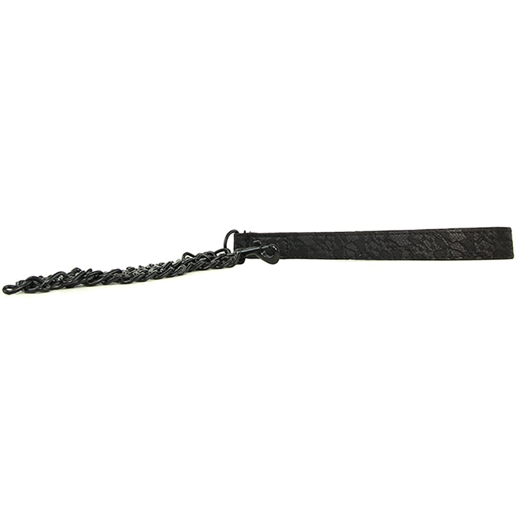 An irresistible piece of high end, fashionable fetish gear from the Sincerely line, the lacy black Collar and Leash duo combines a soft, supple collar in soft designer fabric with a detachable chain length leash and matching wrist strap.