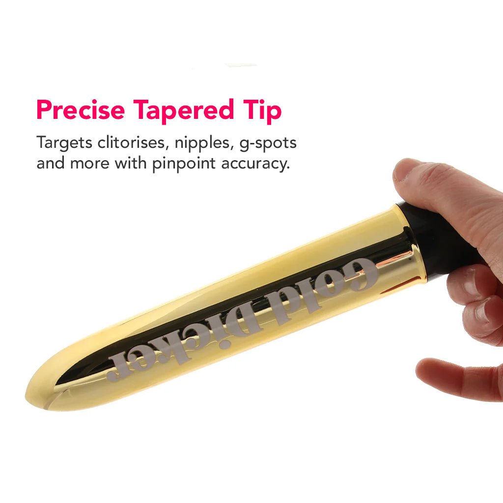 Let's be honest here, when you've got pleasure on the brain, and nothing but the straight-up stimulation of a super-powered classic vibe will do, the wording on that vibe may not be a top priority. But then again, a cheeky phrase certainly can't hurt! The Gold Dicker from CalExotic's Naughty Bits collection offers up all the sleek, versatile pleasure you or your partner could possibly want. Enjoy it inside or out, at home or away, together or solo...you get the picture.