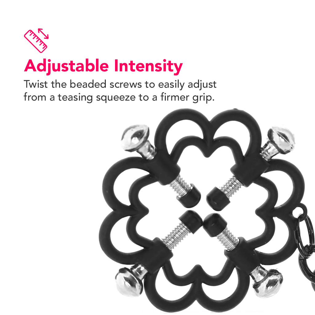 Fully adjustable by design, these clamps are super-easy to customize in terms of tension. Position one of the four screws around a nipple, then twist the beaded tips to close. Here comes the twist - there's a heavy weighted sphere dangling from the base of each. The wearer, whether it's you or your partner, will definitely notice!