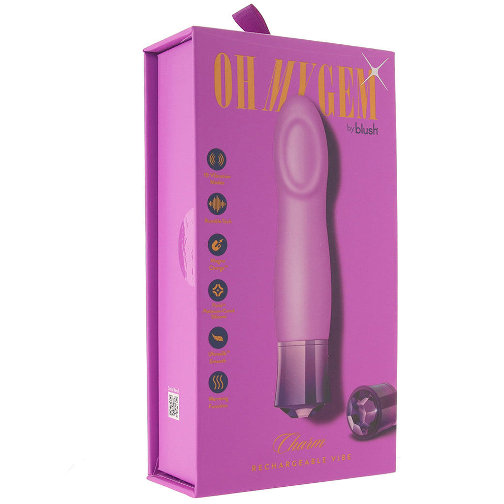 As for vibration, Charm features ten stupendous modes of deep-reaching Rumble Tech vibration. A touch of the glittery base lets you or them power up and scroll through the intensely stimulating options. Need another hit of pleasure? Charm warms up with a double tap.