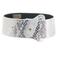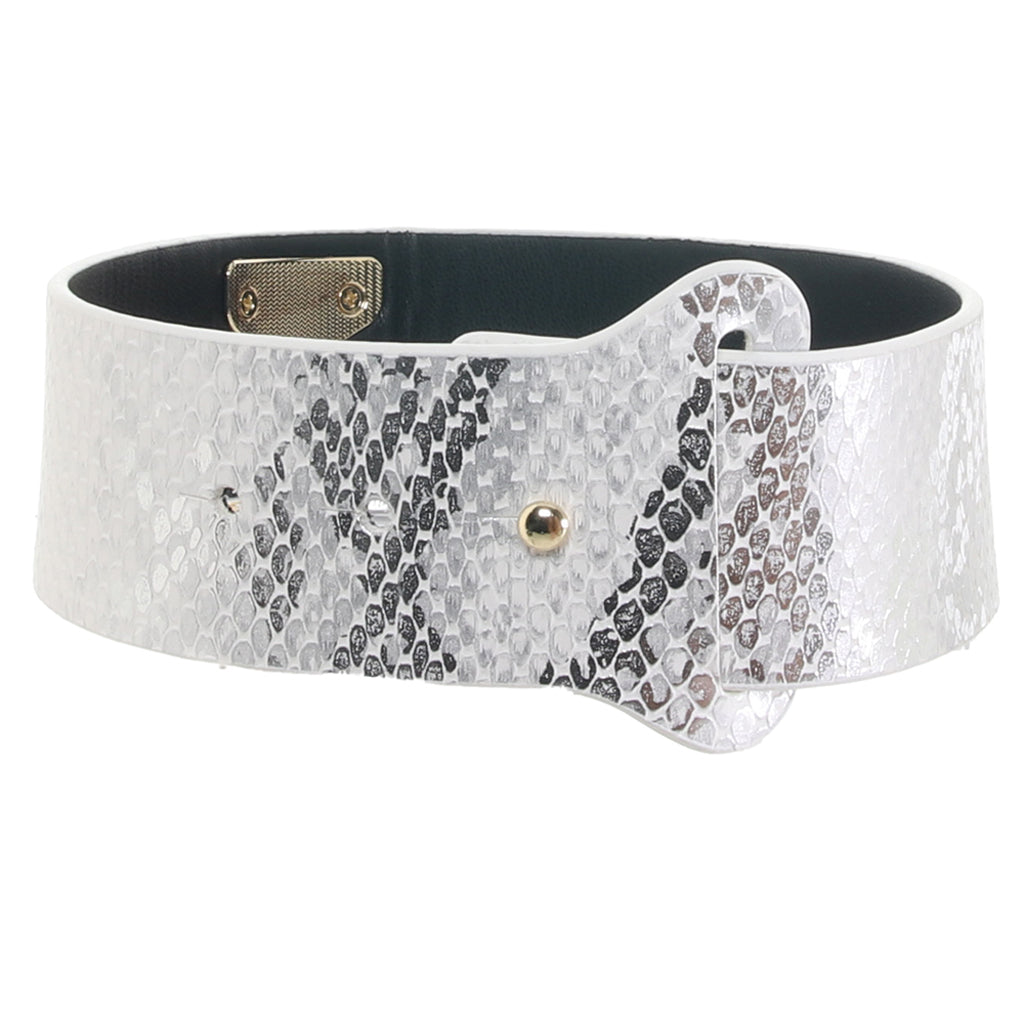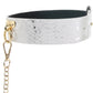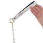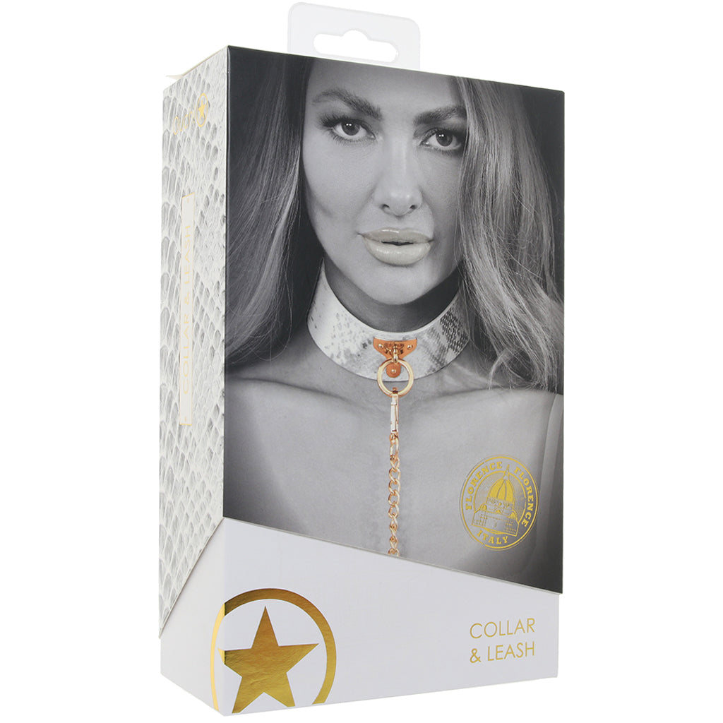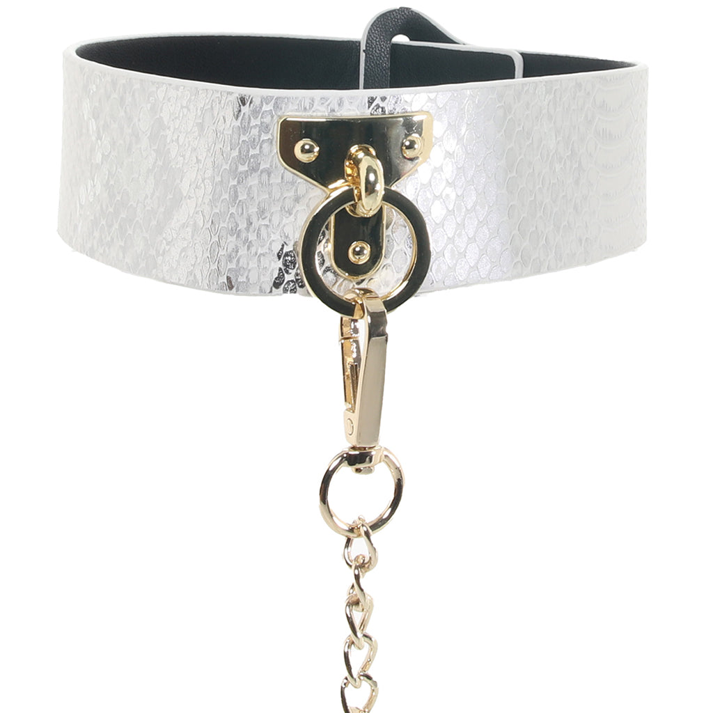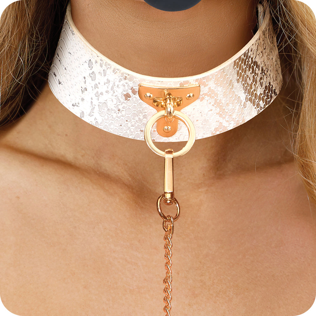 Featuring glossy white faux snakeskin and glam golden details, the thick Collar secures around your or their neck with sturdy snaps. The fully detachable chain leash connects to the center O-ring with a swivel clip that can twist and turn 360 degrees and back—it's about 39"/99cm. You can use either piece together or with other compatible bondage gear, whatever suits the scene.