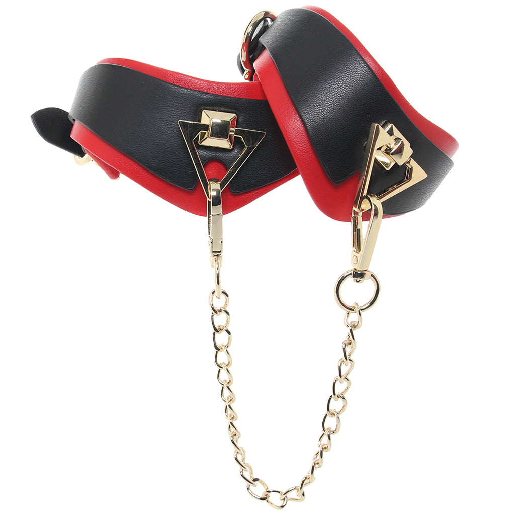 In deep black bonded leather with a bright red lining, these classy triangular cuffs circle your/their ankles oh-so-securely, holding legs immobile and at a partner's (consensual!) mercy. Sturdy metal rings act as a hook-up point for the included connector, or you can use your Cuffs with compatible bondage gear you already own and love.