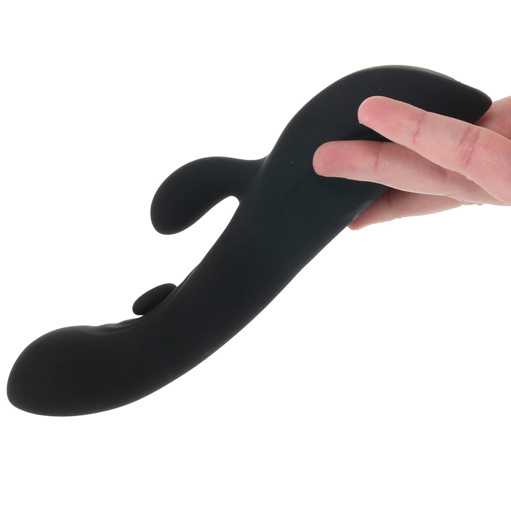 Meanwhile, a silky, VERY flexible outer tickler curves up from below to captivate clits and outer hot spots. You'll have ten modes of penetrator vibration, ten more modes of tapping, and another ten of outer vibration to play with. Separate buttons control each function.