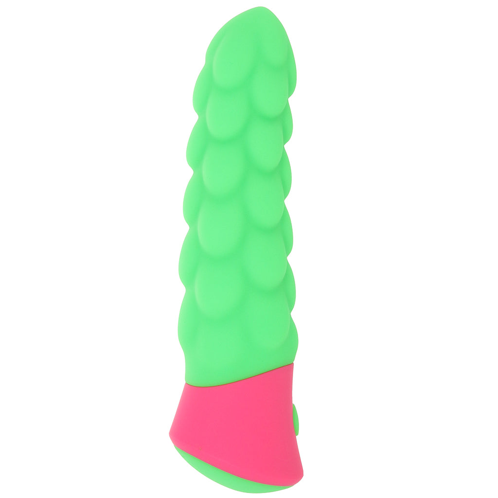 Up top, neon green Ripple is smooth and tapered for comfy penetration—the smoothness doesn't last, though! This vibe's thick, bumpy waves pair with a slightly flexible shape for maximum sensation inside and out.