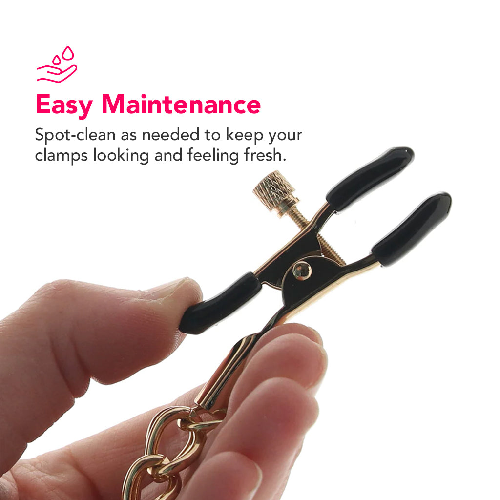 These clamps come in a classic style with adjustable PVC-tipped pinchers that capture your or their nipple flesh from two sides. A double strand of dangly chain swings and swishes, tugs and teases as you play.