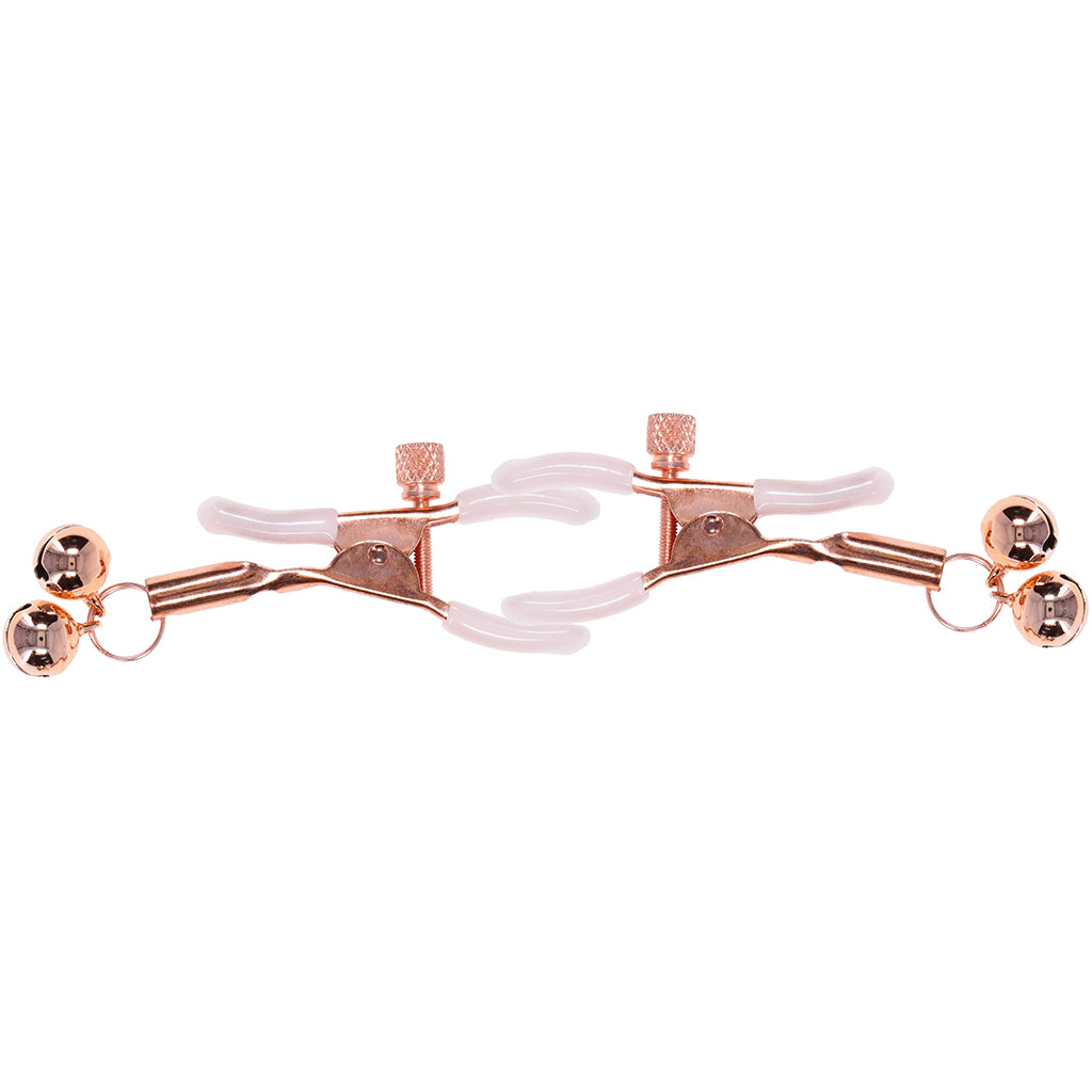 Soft, body-safe rubber wraps the tips for comfort and grip, boosting blood flow for that deliciously sensitive swell. Every move makes the rose gold bells chime, a sweet little soundtrack to your scene that says playtime’s in full swing.