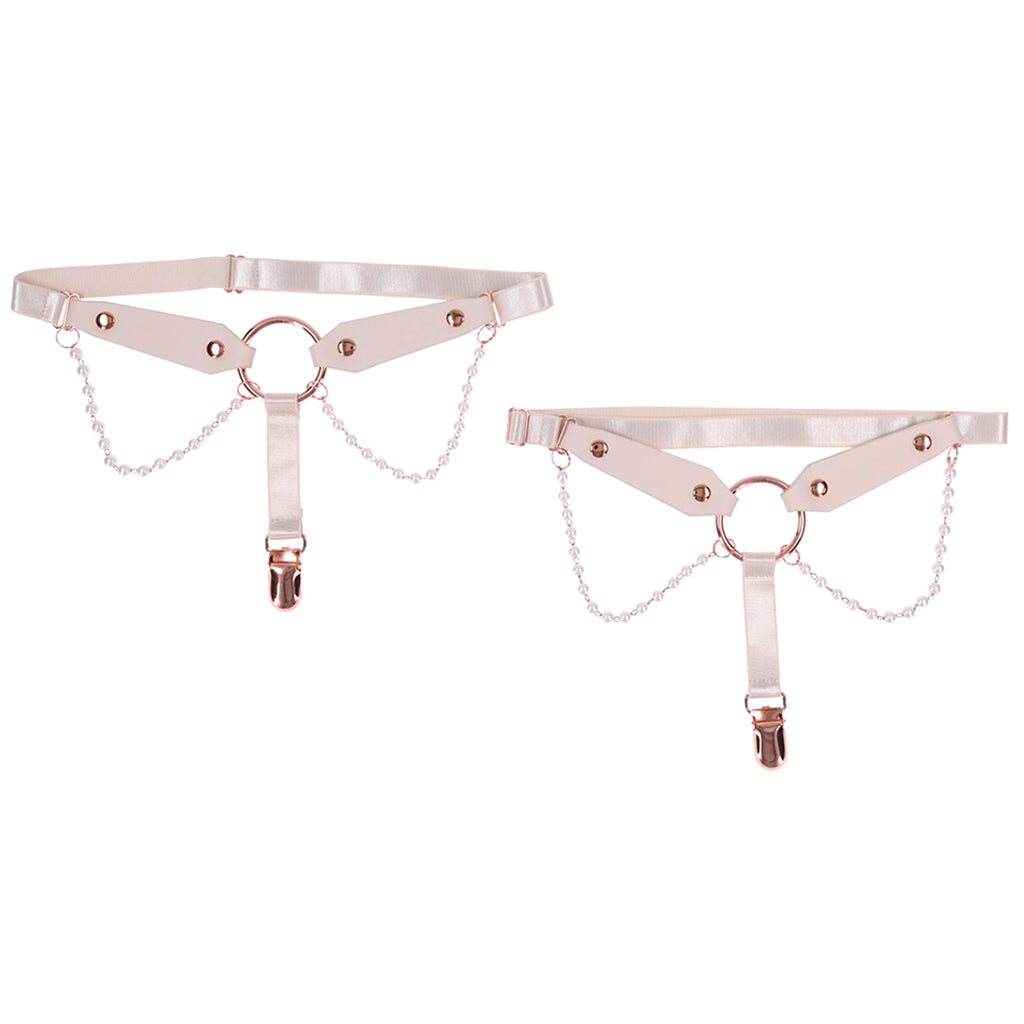 Soft faux leather bands adjust to fit thighs from 18"/45cm to 26"/66cm, hugging like a sensual secret you can’t wait to reveal. Delicate pearl strands sway with each movement, while a gleaming rose gold O-Ring and secure garter clips keep stockings in place and eyes locked on you.