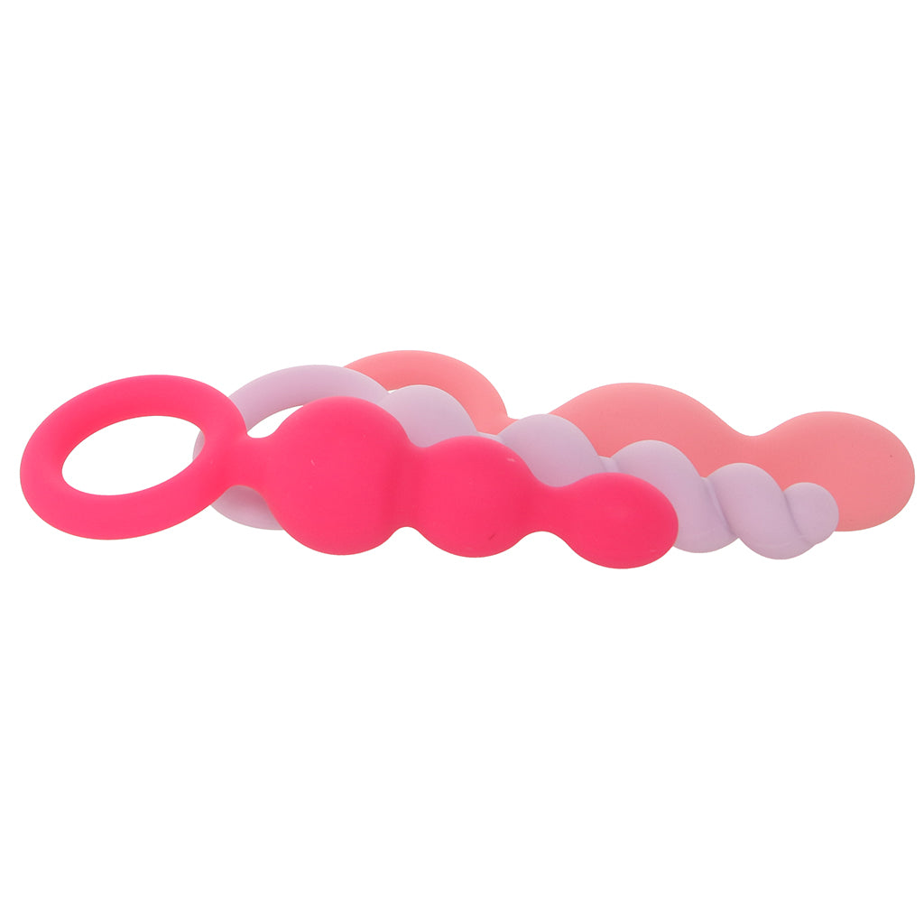 Offering three distinct shapes to backdoor pleasure seekers, this trio of silky silicone plugs includes a sexy swirly screw, a triple beaded blast of stimulation and a double barreled probe for maximum stretch. Perfect for just about any level of anal experience, the purple swirl and popsicle-pink triple versions both start off petite and forgiving before swelling to their largest points, while the lighter pink double provides a more dramatic 'pop' right off the bat.