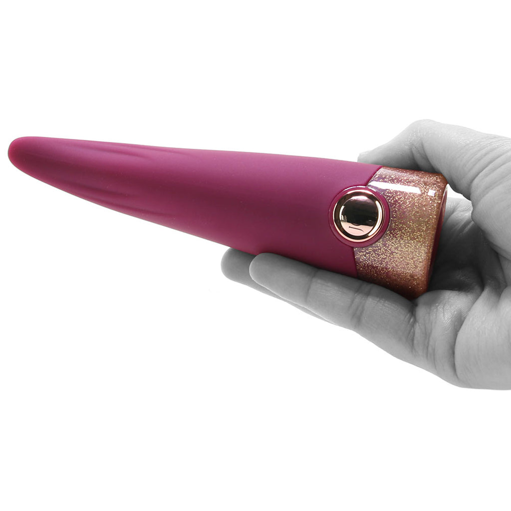 Take your pick from Fling's seven blissful modes and 5 possible intensities of steady, throbbing and pulsating vibration. Activate and vary the rhythm with a big button at the glittery base, and tap the up and down keys (located at the side of the handle) to speed or slow intensity.