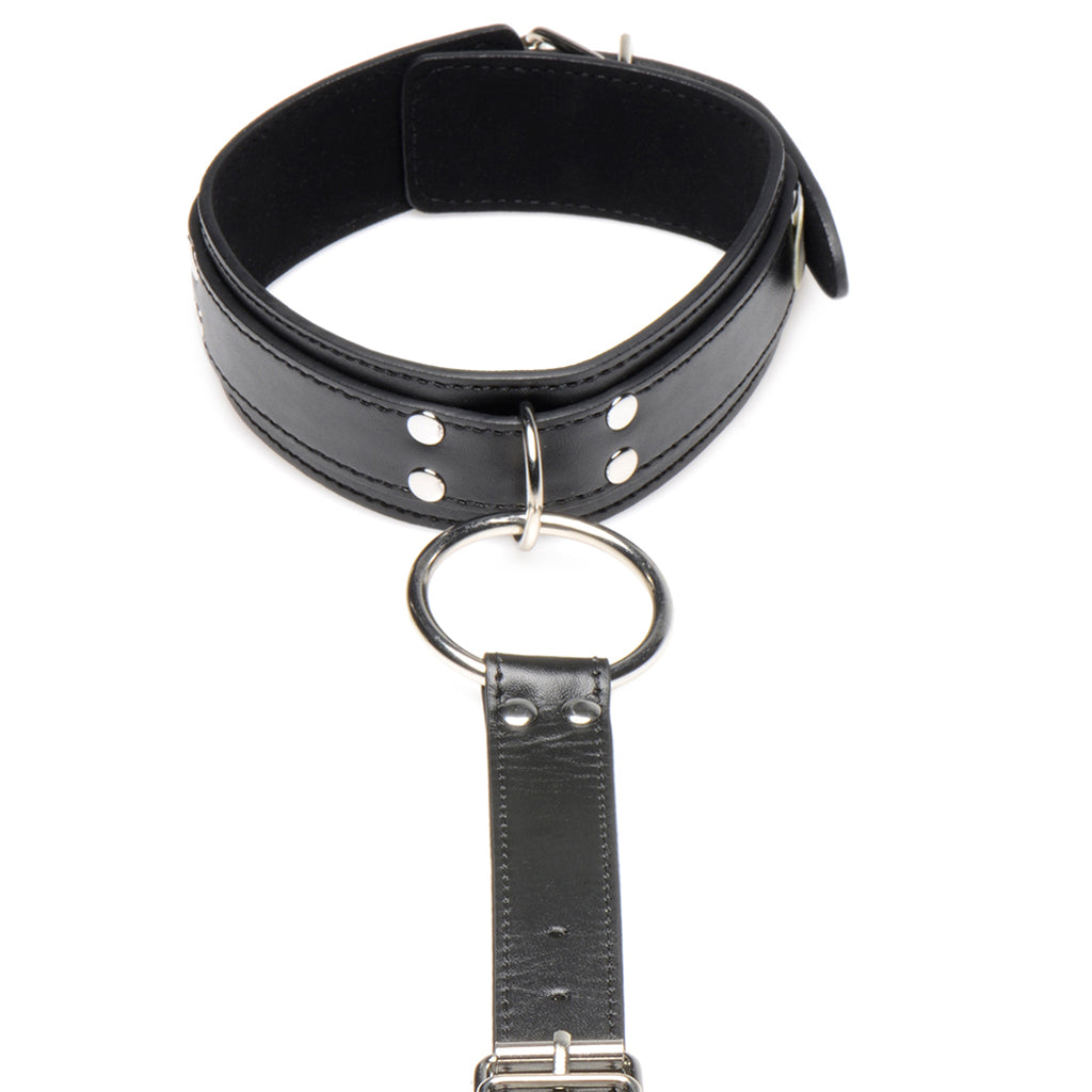 In comfy padded faux leather, the Neck to Wrists Restraints, like the name suggests, secure your or your partners wrists via fixed cuffs to a thick collar above a vertical body-skimming strap. Each piece is fully adjustable, and can be worn to the front or back. Plus, there are two big O-rings just waiting to be hooked up to plenty of compatible gear.