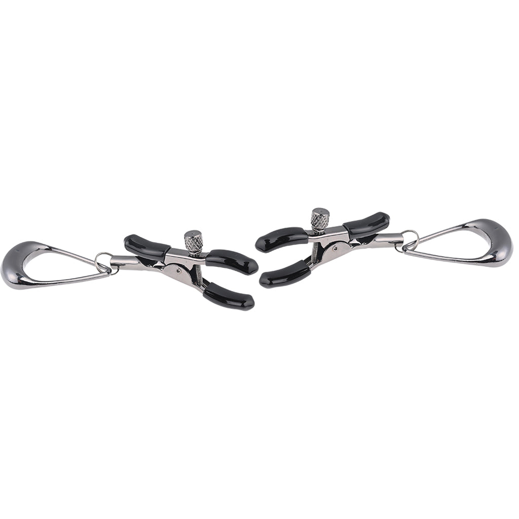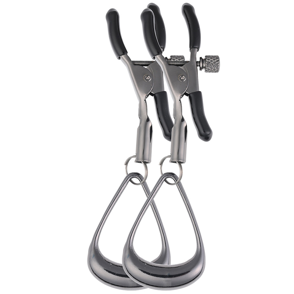 These weighty, silicone-tipped alligator clamps are fully adjustable, pressure-wise—twist the screws to loosen or tighten. Meanwhile, big hematite loops sway and swing from the base of each for lots of namesake tugging as you play. You can attach other weights or bondage gear, too.